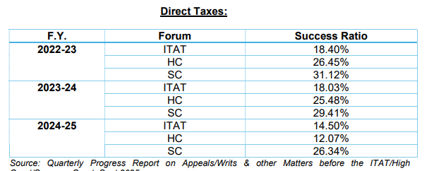 समिति की रिपोर्ट के अनुसार, प्रत्यक्ष कर मामलों में, आयकर अपीलीय न्यायाधिकरण में विभाग की सफलता दर 2024-25 में घटकर 14.5% हो गई, जबकि उच्च न्यायालयों में यह तेजी से गिरकर 12.07% हो गई। इसकी तुलना में, 2023-24 में आईटीएटी में सफलता दर 18.03% और उच्च न्यायालयों में 25.48% थी, और 2022-23 में क्रमशः 18.40% और 26.45% थी।