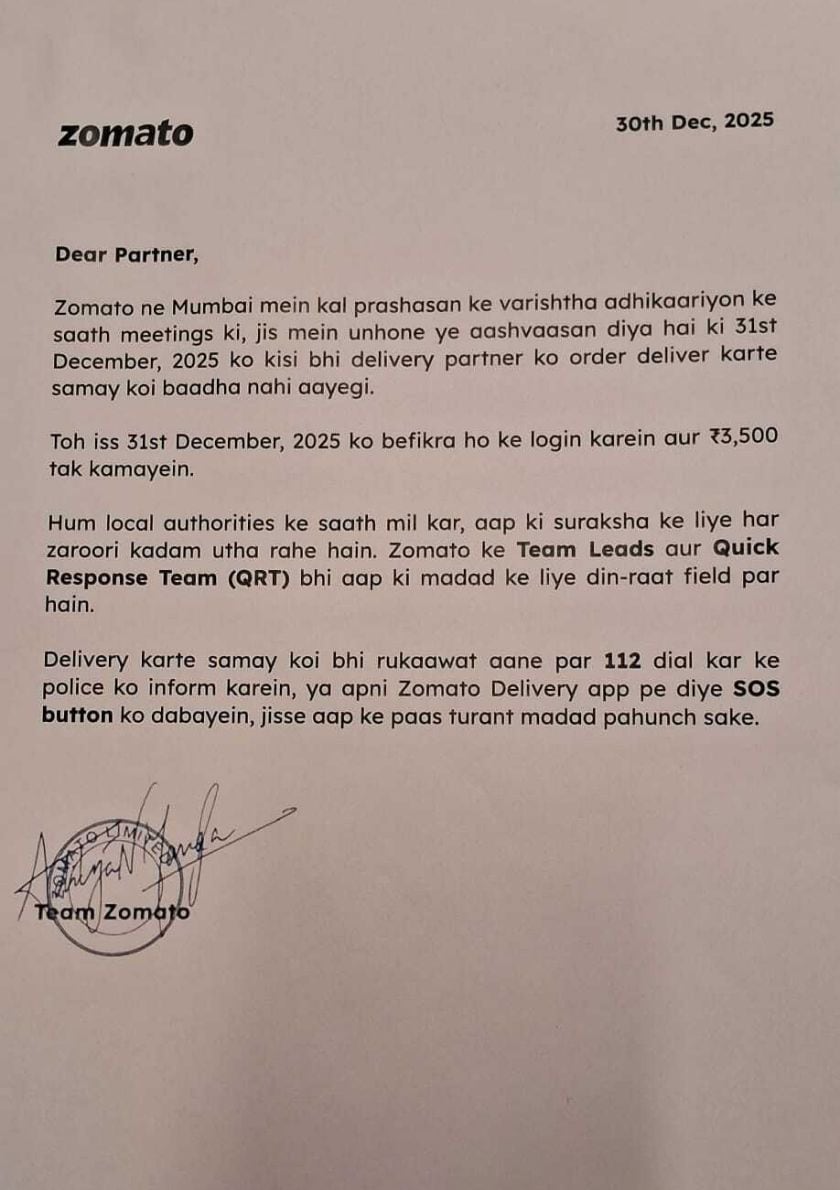 संभावित व्यवधानों पर चिंताओं के बीच, ज़ोमैटो ने 31 दिसंबर, 2025 से पहले अपने मुंबई डिलीवरी भागीदारों को आश्वस्त करने के लिए यह परिपत्र भी जारी किया है। कंपनी का कहना है कि उसने वरिष्ठ स्थानीय प्रशासन अधिकारियों के साथ बैठकें की हैं, जिन्होंने आश्वासन दिया है कि नए साल की पूर्व संध्या पर ऑर्डर वितरित करते समय डिलीवरी भागीदारों को किसी भी बाधा का सामना नहीं करना पड़ेगा।